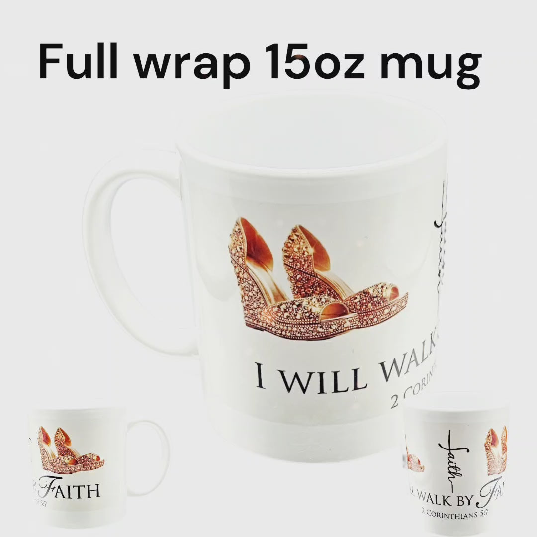 Sip in Faith with my "I Will Walk By Faith" Full-Wrap Ceramic Mug. Inspired by 2 Corinthians 5:7, these mugs are designed for the woman who walks in grace, hope, and unwavering faith. Featuring beautiful, high-definition digital artwork of jewel-toned heels, crystal-embellished flip flops, and delicate floral accents, each mug serves as a beautiful daily reminder that your journey is guided by Jesus.